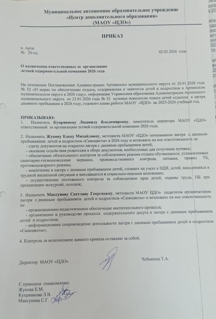 - Приказ МАОУ «ЦДО» от 02.02.2026 № 26-од «О назначении ответственных за организацию летней оздоровительной компании 2026 года»