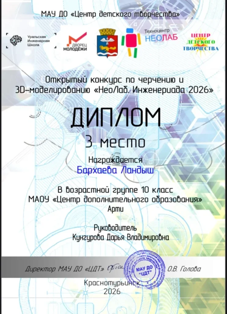 Что необходимо было сделать? За отведенные 3 часа в реальном времени ребятам предлагалось выполнить 2 задания: 1. Разработка изометрических проекций деталей в ПО «Компас 3Д»; 2. Работа над творческим заданием «Разработка 3Д модели космической станции». «Данный конкурс позволяет обучающимся решать поставленные задачи «здесь и сейчас», а также, учит самостоятельно распределять время на выполнение полученных заданий» — отметила педагог Дарья Владимировна Кунгурова. Честь Центра дополнительного образования представляла Бархаева Ландыш, в возрастной категории: «10 класс».
