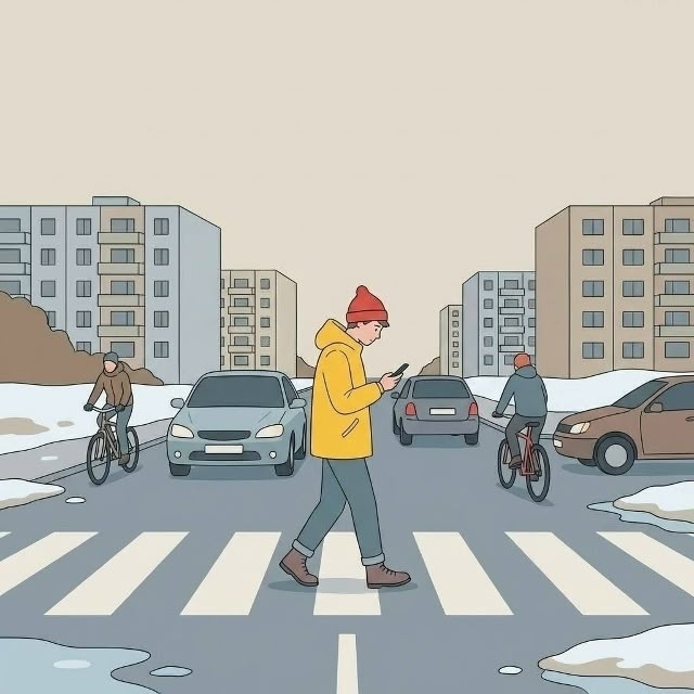 Остановитесь перед «зеброй», убедитесь, что водители вас видят. Телефон может подождать.